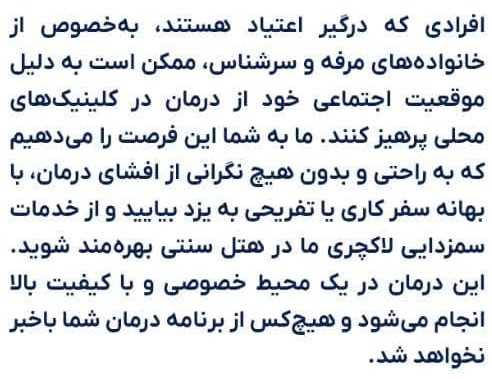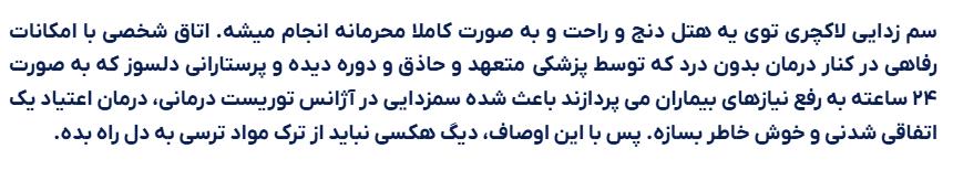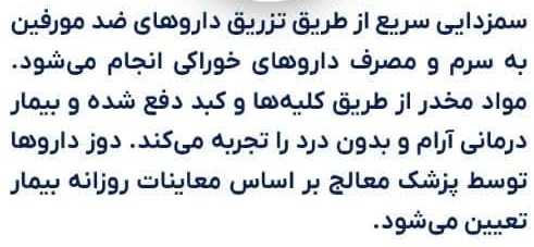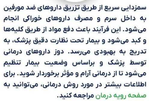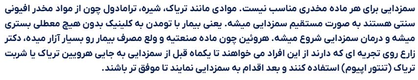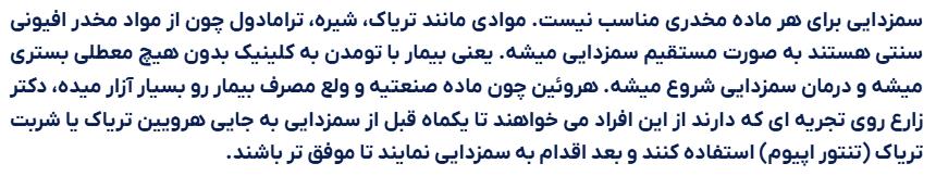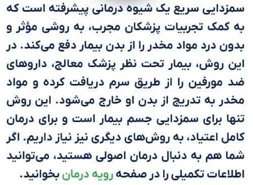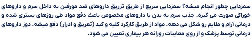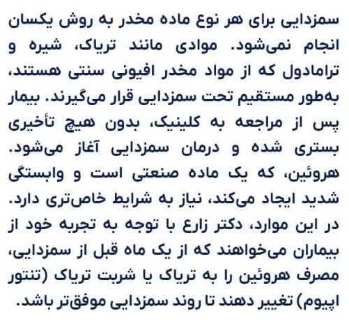 سمزدایی چیست؟ سمزدایی سریع یک شیوه درمان نوین است که بسته به علم هر پزشک و تجربه کاری که طی سالها درمان بیماران درگیر مواد مخدر کسب کرده است گفته می شود. در شیوه سمزدایی، به بیمار سرم وصل شده و پزشک با معاینات خود مقدار و نوع داروهای ضد مورفین را در سرم وارد کرده و باعث دفع مواد مخدر از بدن بیمار بدون درد و عوارض می شود. سمزدایی فقط جسم بیمار رو از مواد مخدر درمان می کنه.